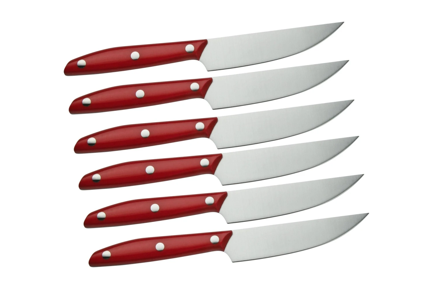 Ce set de 6 couteaux à steak, rouge, Due Cigni 1896 America est un set de couteaux original et élégant. Un bon couteau à steak est indispensable pour les vrais amateurs de viande. Il permet de couper facilement un steak ou un autre morceau de viande sans la déchirer. Le design mince et gracieux permet, en prime, de dresser une superbe table pour impressionner vos invités ! Ce set est livré dans son coffret en bois.
