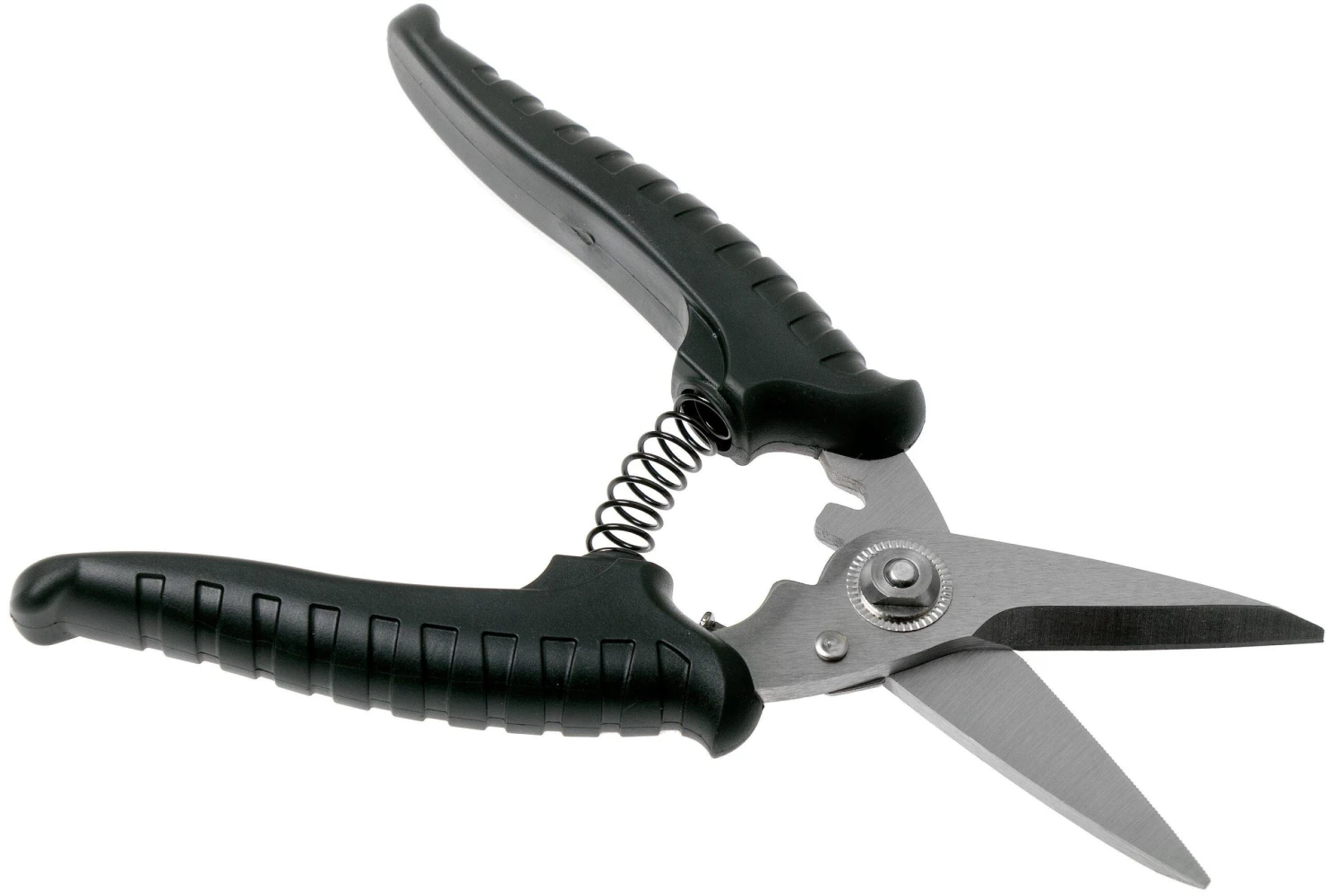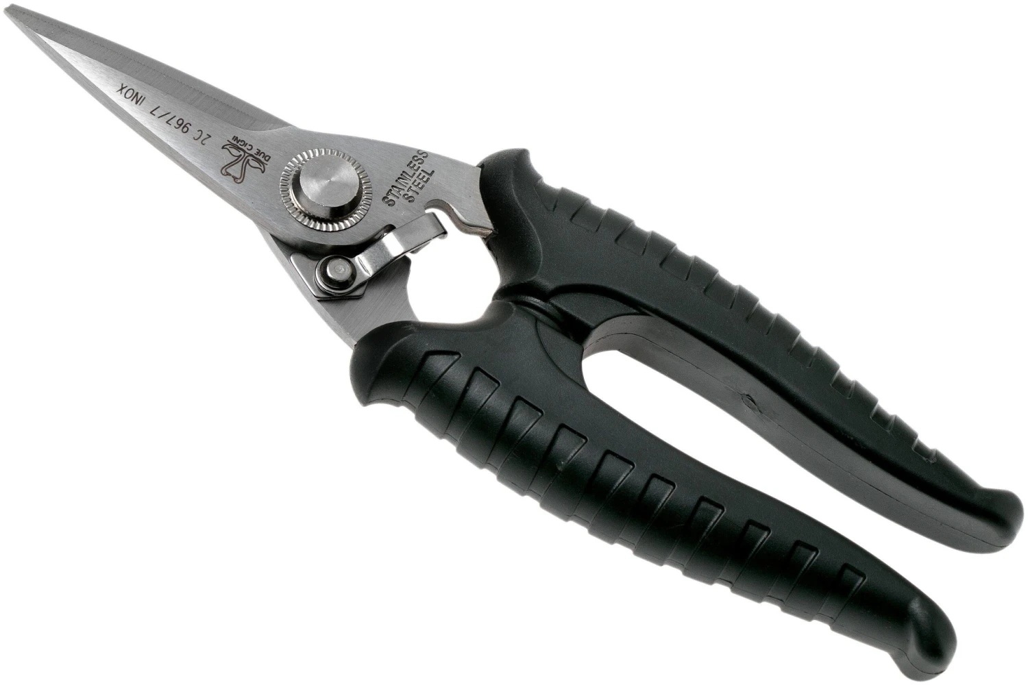 Cette paire de ciseaux de cuisine multifonction Due Cigni est dotée de microdentelures sur un des côtés. Ces ciseaux permettent donc de couper toutes sortes de tissus, même les plus épais, comme le cuir et le denim, par exemple. Les microdentelures permettent de couper bien droit. L’extrémité pointue permet de couper du filet en nylon et en métal jusqu’à 0,5 mm d’épaisseur.