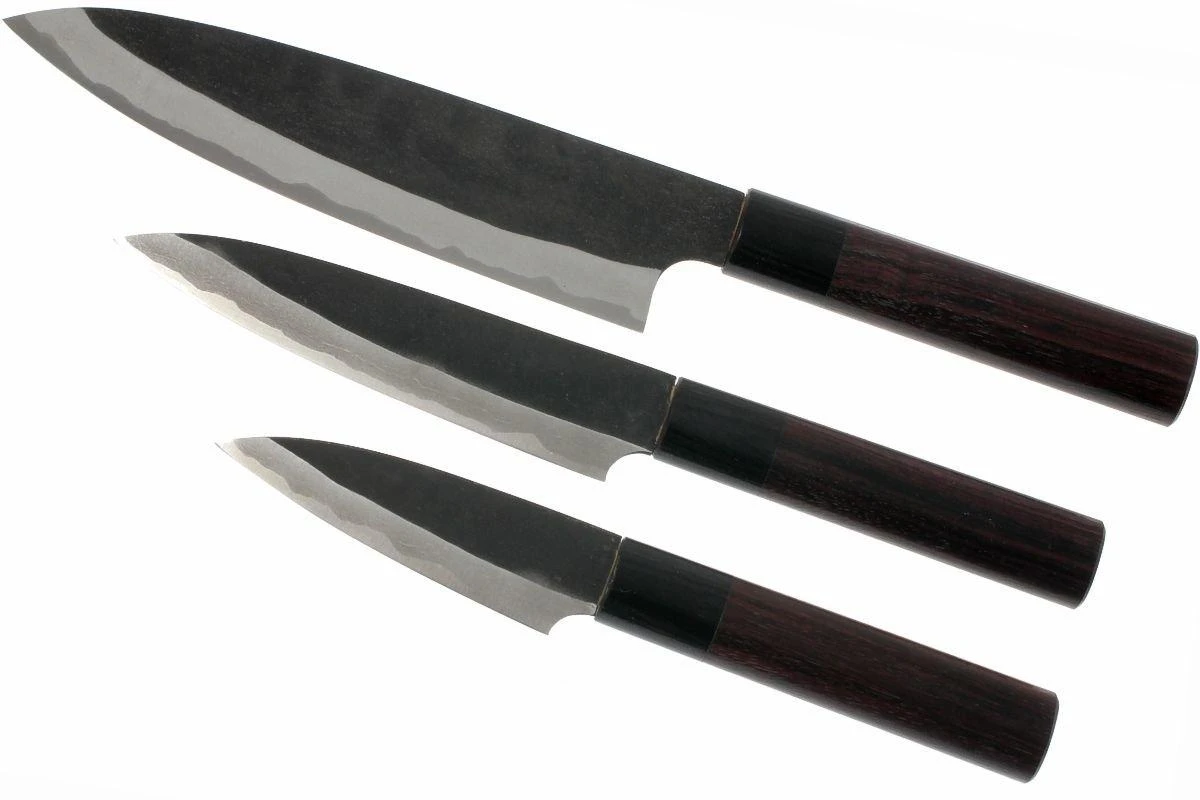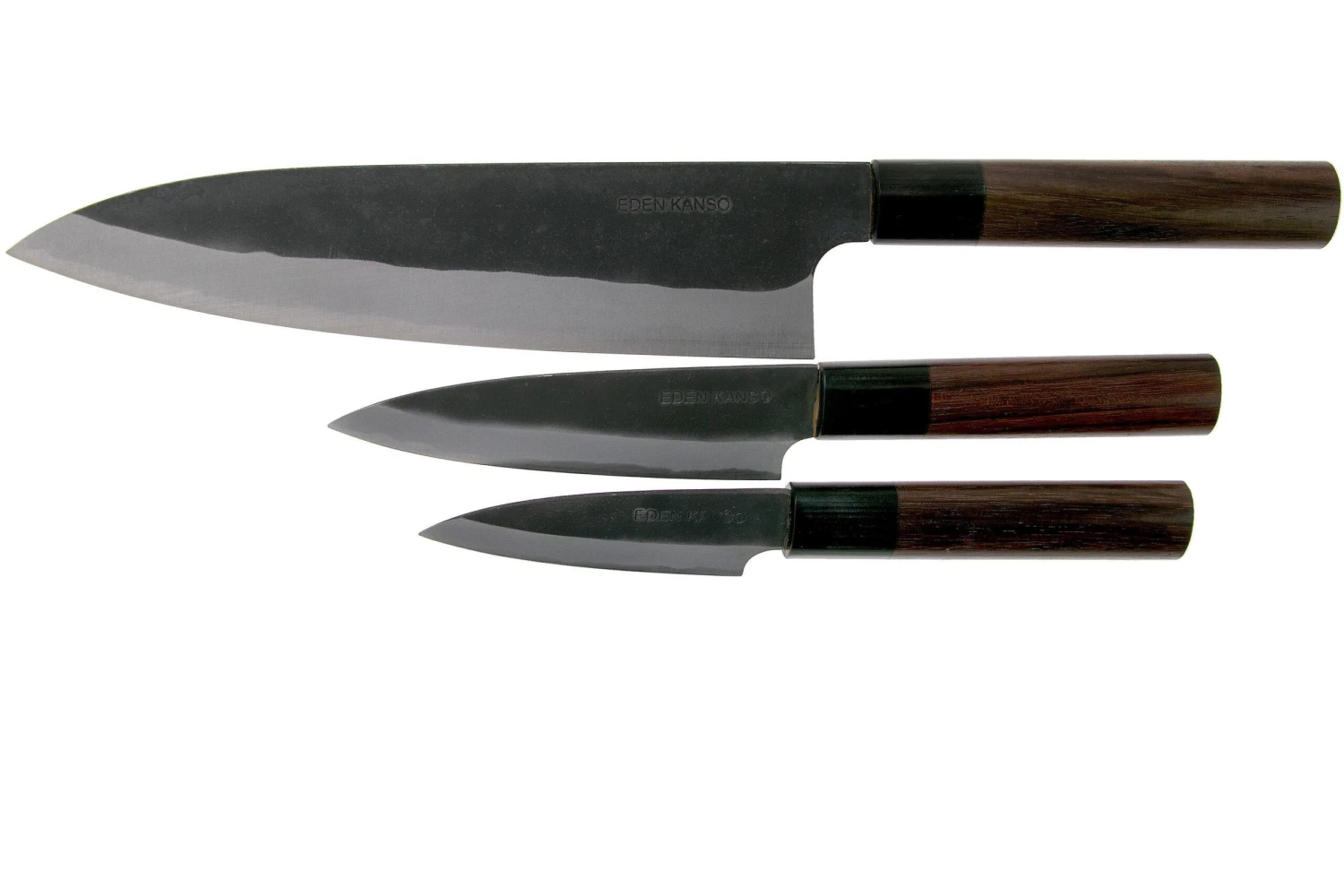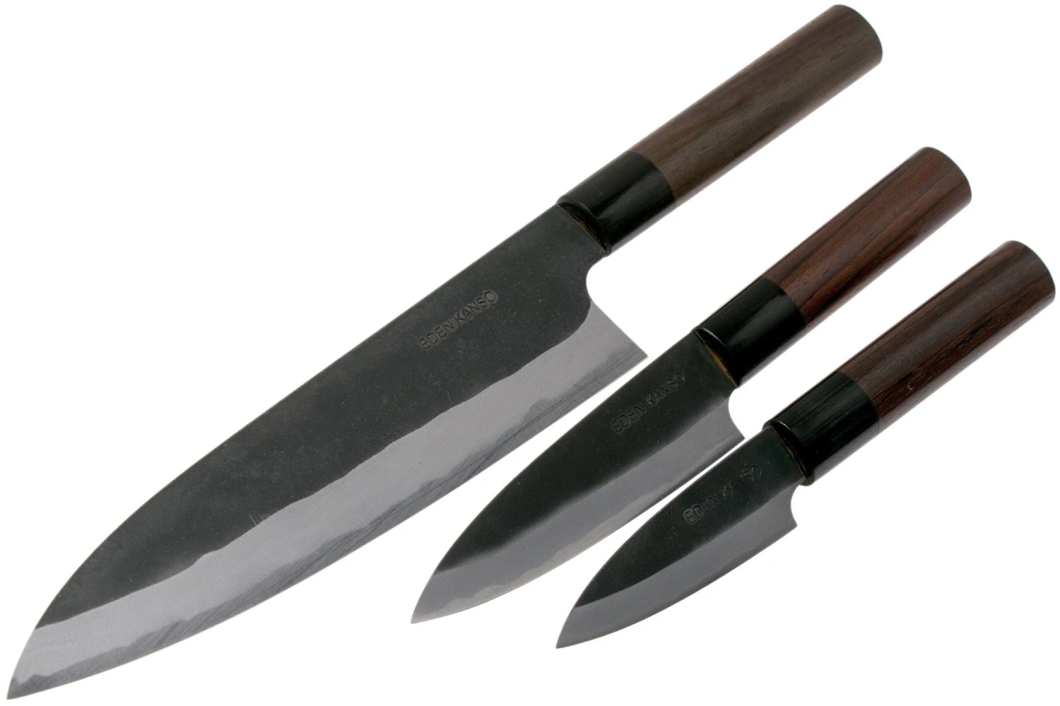 Ensemble de 3 couteaux de la série Eden Kanso Aogami. Les couteaux les plus tranchants de notre assortiment ! Une lame fine et très résistante en acier carbone (Aogami #2), pour une coupe parfaite.