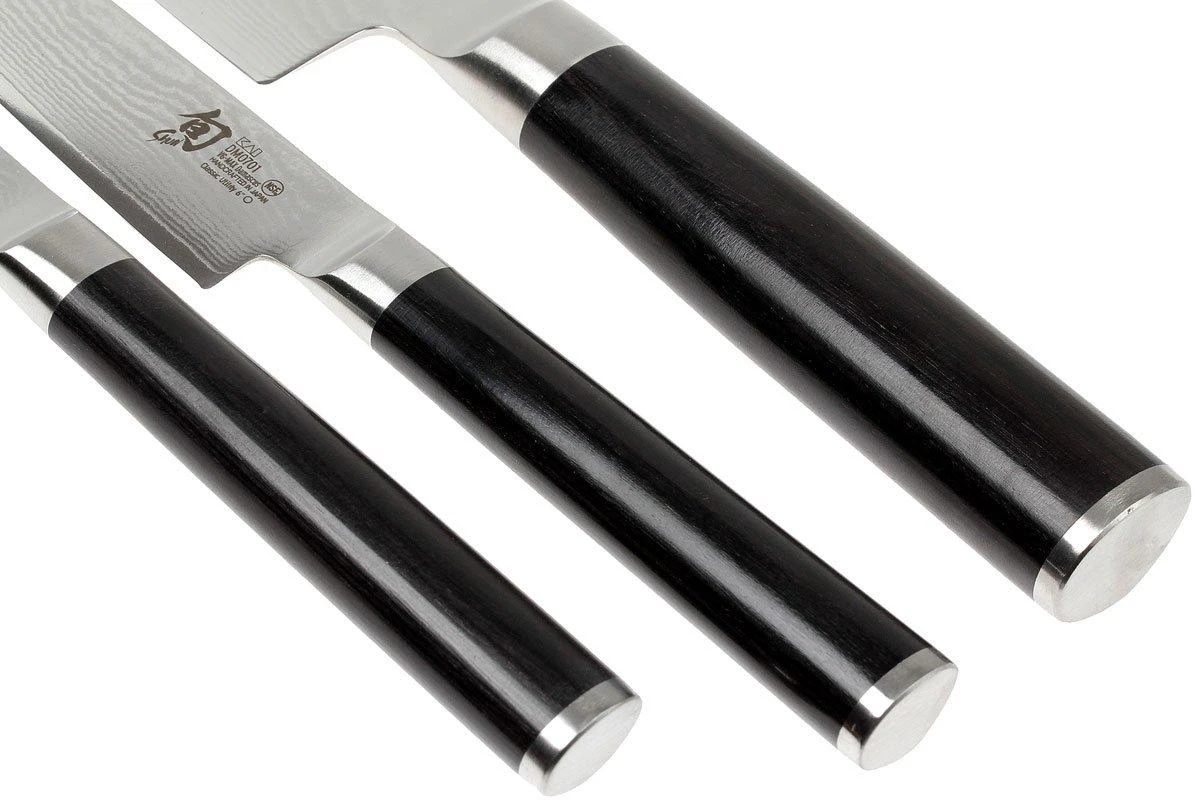 Cet ensemble de couteaux Kai Shun se compose de trois couteaux. Kai utilise un acier damast à 32 couches, résistant à la corrosion pour la conception de la gamme Kai Shun Classic. Cet acier damast est composé de nombreuses couches d’acier pour finalement former une seule lame. Ce type d’acier est donc très dur. Le noyau en acier VG-MAX garantit des propriétés de coupes sans pareille. La dureté de ces couteaux est extrême avec 61 +/-1 HRC. Ces couteaux conservent donc parfaitement leur tranchant. Les manches sont en bois pakka stratifié avec une forme asymétrique. Vous avez tout ce dont vous avez besoin pour cuisiner grâce à cet ensemble composé d’un couteau de chef, un couteau universel et un couteau à éplucher. Pour une expérience encore plus complète, cet ensemble est également disponible avec une planche à découper. Leur apparence et leur propriété de coupe ultime rendent ces couteaux aussi agréable à regarder qu’à utiliser !