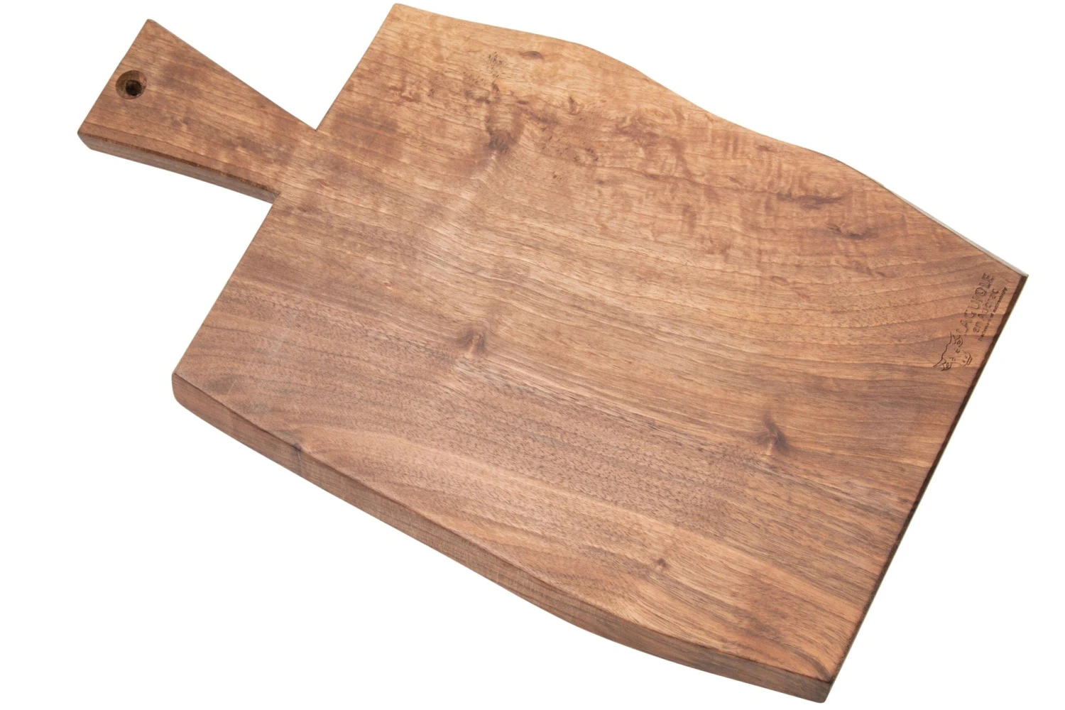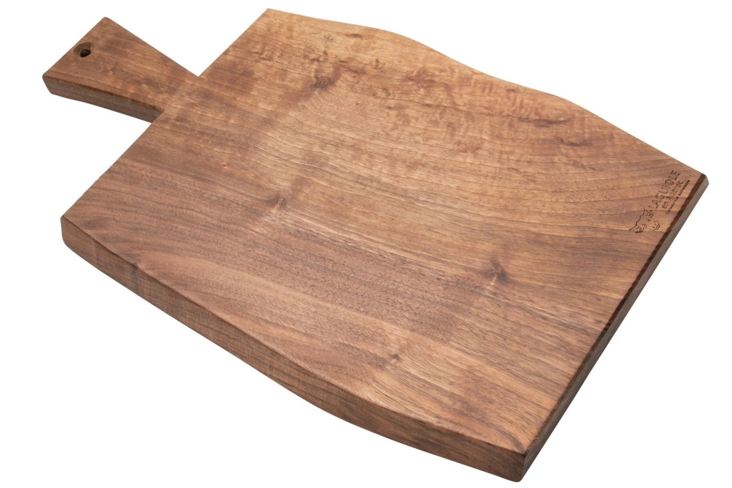 Cette planche à découper en bois de noyer Laguiole en Aubrac est une magnifique planche à découper dont chaque exemplaire est unique. C’est dû aux variations naturelles dans les lignes du bois. Les bords sont laissés bruts, ce qui donne également à chaque planche une forme différente. La planche ne dispose pas de pieds et peut donc être utilisée des deux côtés. Idéal pour y couper des aliments ou pour faire une belle présentation. La planche est assez tendre pour vos couteaux.