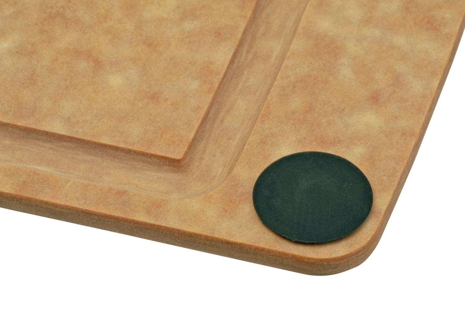 Cette Victorinox All-in-one 7.4125 est une planche à découper de 29 cm de large sur 23 cm de long. Elle est faite en Richlite marron. Un matériau composé d’un mélange de 65% de pulpe de bois certifiée FSC et de 35% de résine phénolique. Cela donne une planche mince avec une surface lisse non poreuse, sans BPA, résistante à la chaleur et surtout hygiénique. Ce matériau est suffisamment souple pour ne pas détériorer le tranchant des couteaux tout en étant assez dur pour ne pas être entaillé trop profondément.