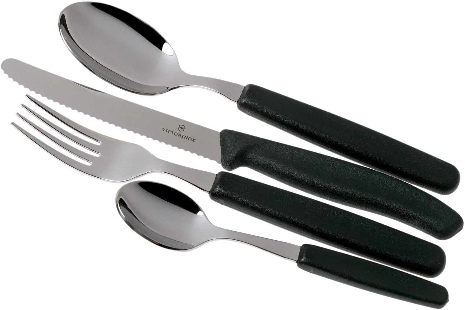 Le set de couteaux Victorinox SwissClassic 24 pièces est un ensemble de 6 couteaux à tomates dentelés, 6 fourchettes, 6 cuillères à soupe et 6 cuillères à café. Légers et polyvalents.